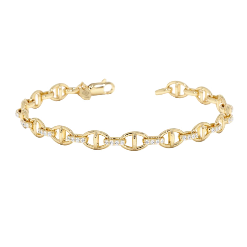 A timeless statement of elegance, this gold-plated bracelet features interlocking links accented with brilliant cubic zirconia stones for a touch of refined sparkle. Sleek, versatile, and effortlessly chic — perfect for elevating both everyday looks and evening ensembles.